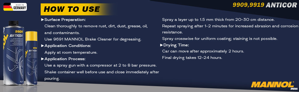 Application: before applying the product, the surface must be thoroughly cleaned of rust, dirt and dust, grease, oil and other organic contaminants. For degreasing, we recommend using 9691 MANNOL Brake Cleaner. For best results, it is recommended to apply the product at room temperature.